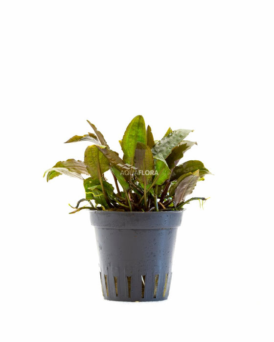 Een prachtige Cryptocoryne, groen aan de bovenkant, purperrood aan de onderkant. Het blad heeft een mooie hamerslag structuur in de bladeren. De redelijk brede bladeren staan op een steel van ongeveer 5 cm lang.